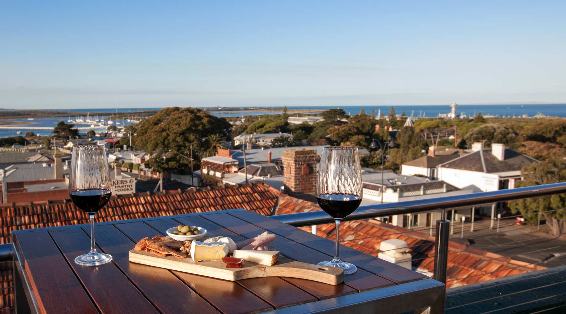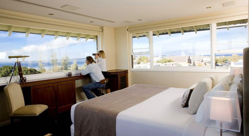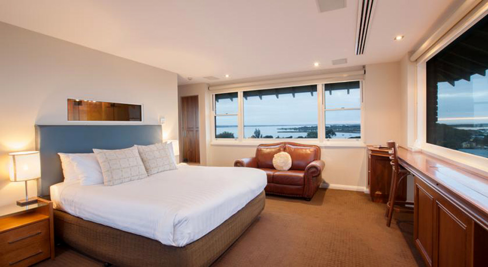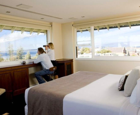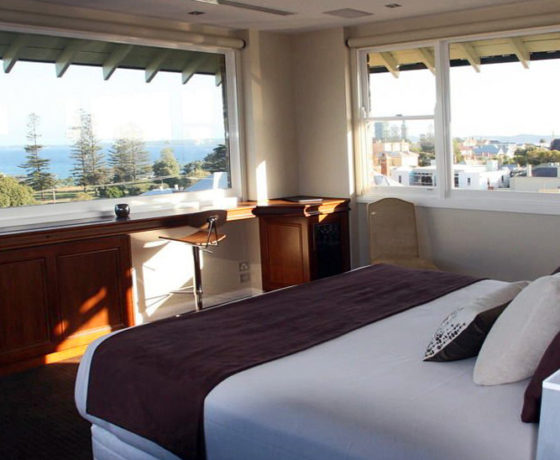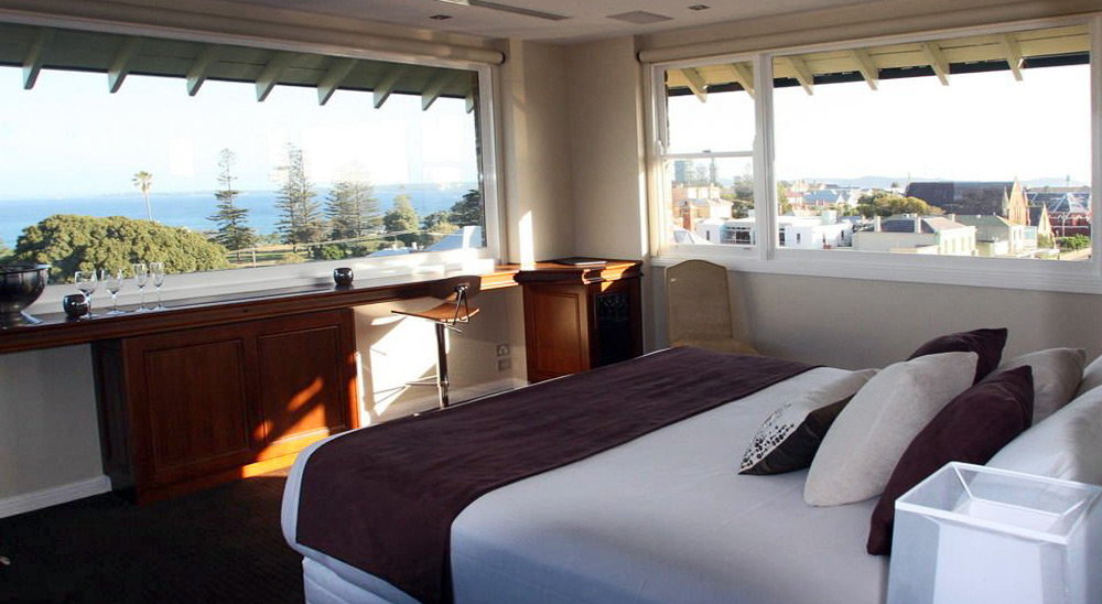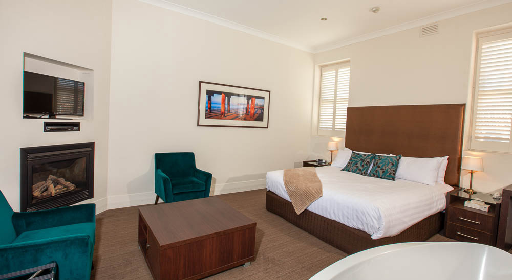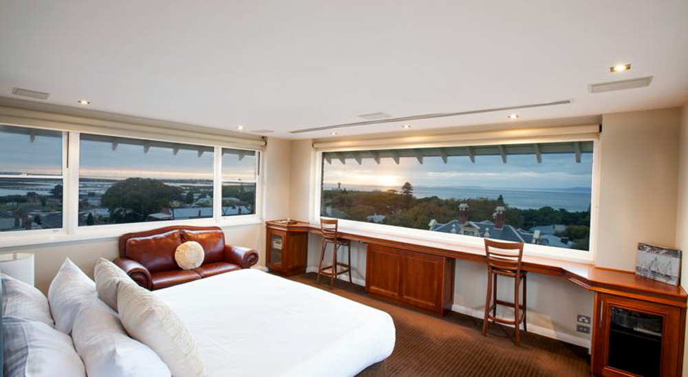 Located at the very top of the hotel, the Turret Suite boasts 180 degree views of Swan Bay, Queenscliff’s iconic Hesse Street and Port Phillip Heads. Boasting a lavish décor and furnishings include a plasma TV screen, King Size bed, heated floor tiles in the bathroom and a spa overlooking the ocean.